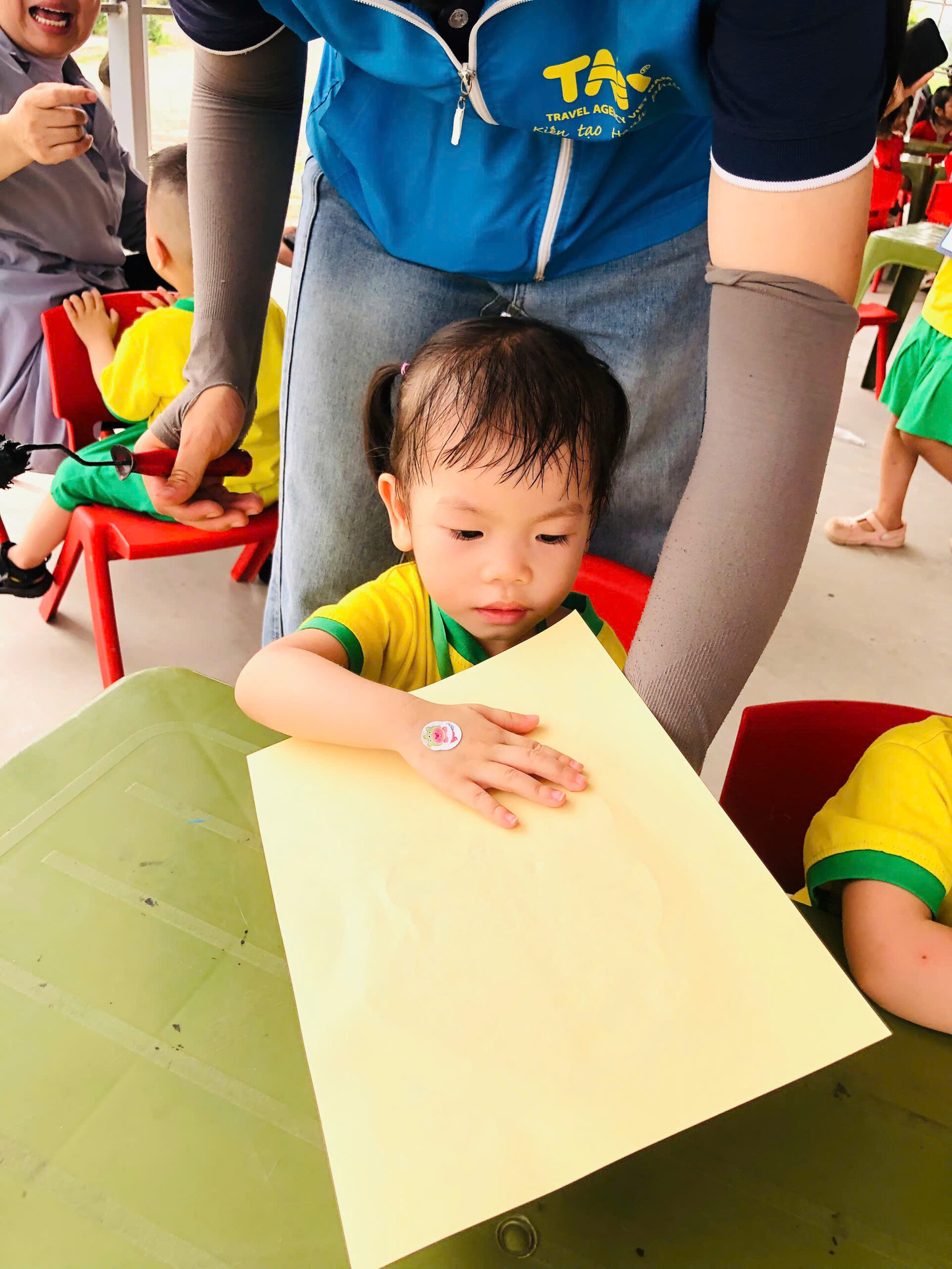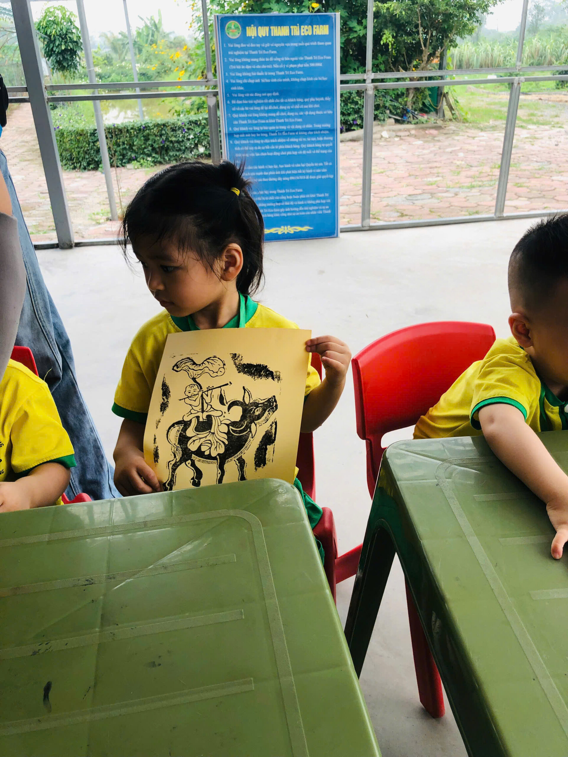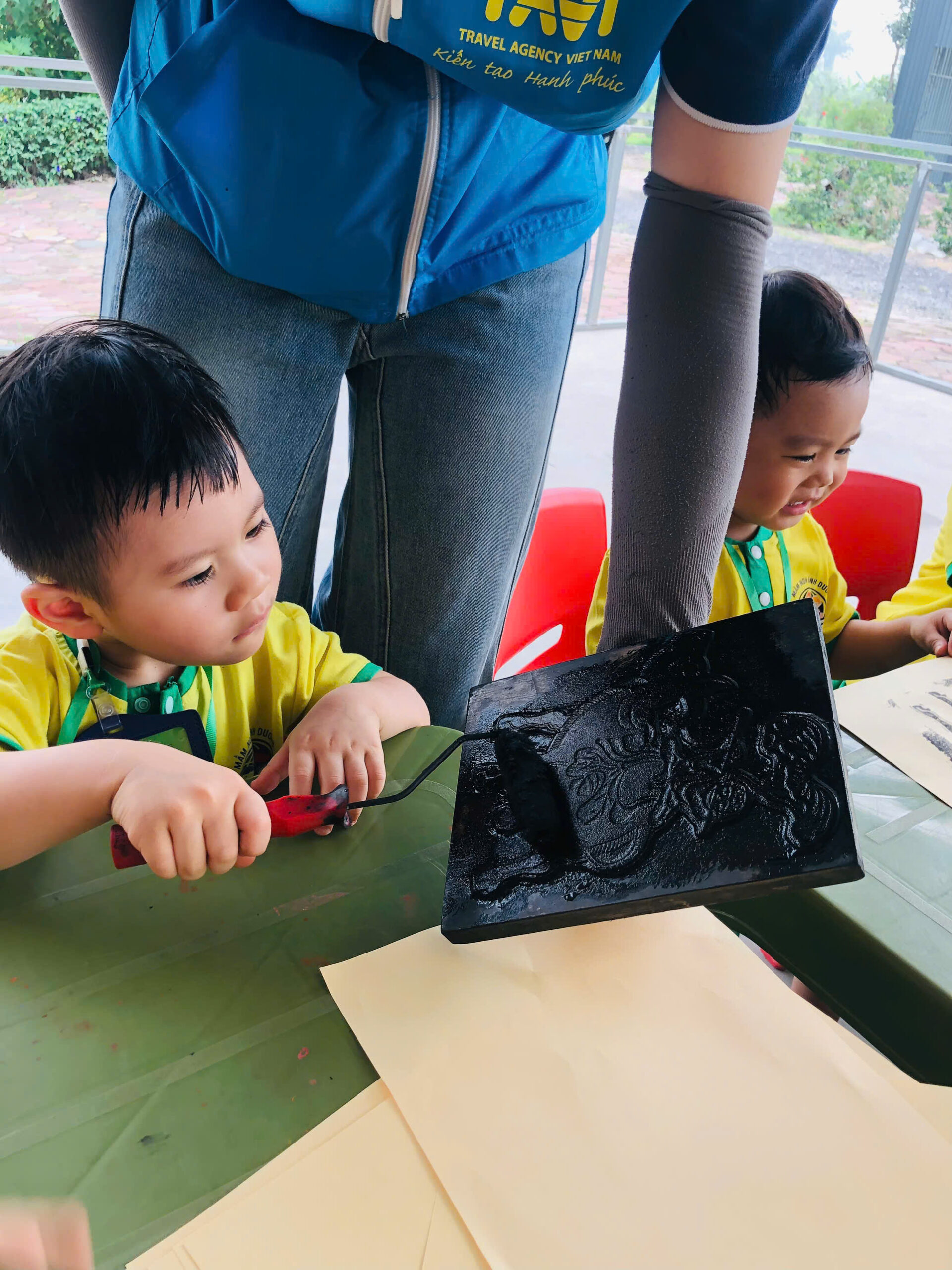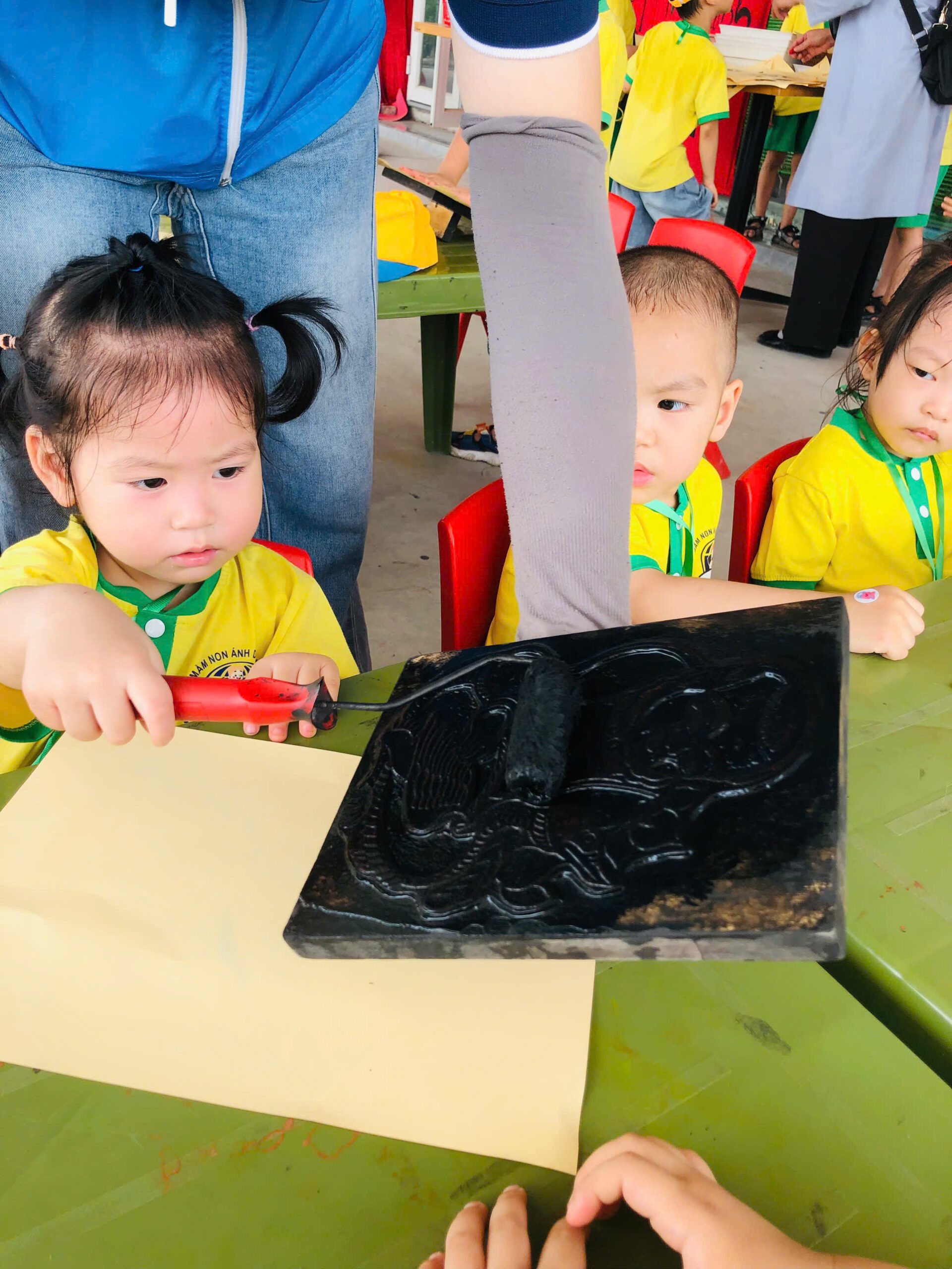 - Nghệ thuật trong lòng bàn tay: Bên những khung hình nhỏ, các con say sưa với trải nghiệm vẽ tranh dân gian. Những bàn tay nhỏ lấm lem màu mực nhưng lại tràn đầy sự tập trung, học cách yêu nét đẹp văn hóa truyền thống qua từng bức tranh Đông Hồ mộc mạc.