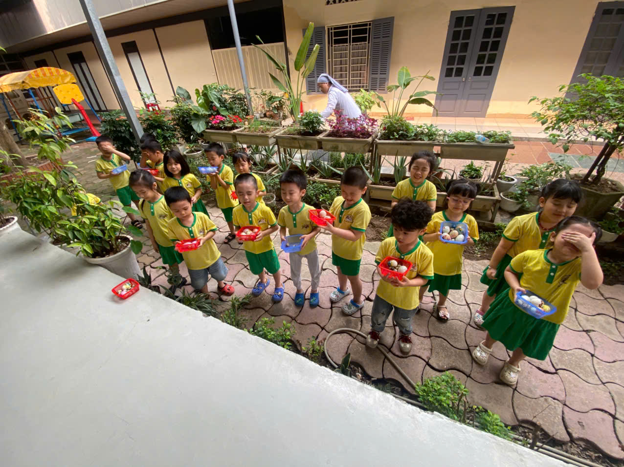 Ngồi quây quần bên nhau, các con cùng bóc vỏ trứng và thưởng thức thành quả. Đây là lúc giáo dục vệ sinh và dinh dưỡng được lồng ghép khéo léo. Các Soeurs, các cô hướng dẫn trẻ cách bóc trứng sạch sẽ, cách bỏ vỏ đúng nơi quy định và giải thích về giá trị dinh dưỡng của trứng – nguồn protein tuyệt vời giúp cơ thể lớn nhanh và khỏe mạnh.
