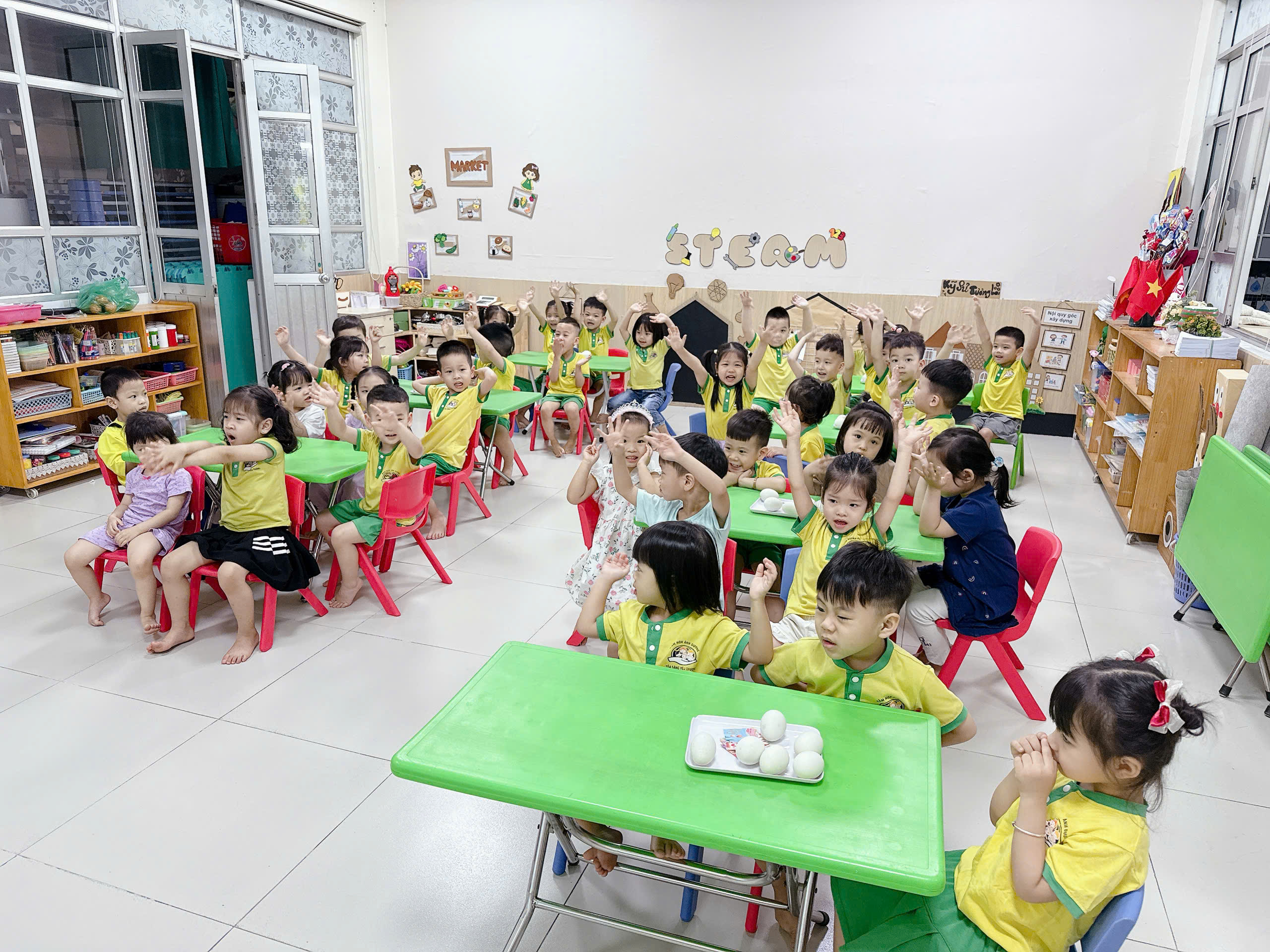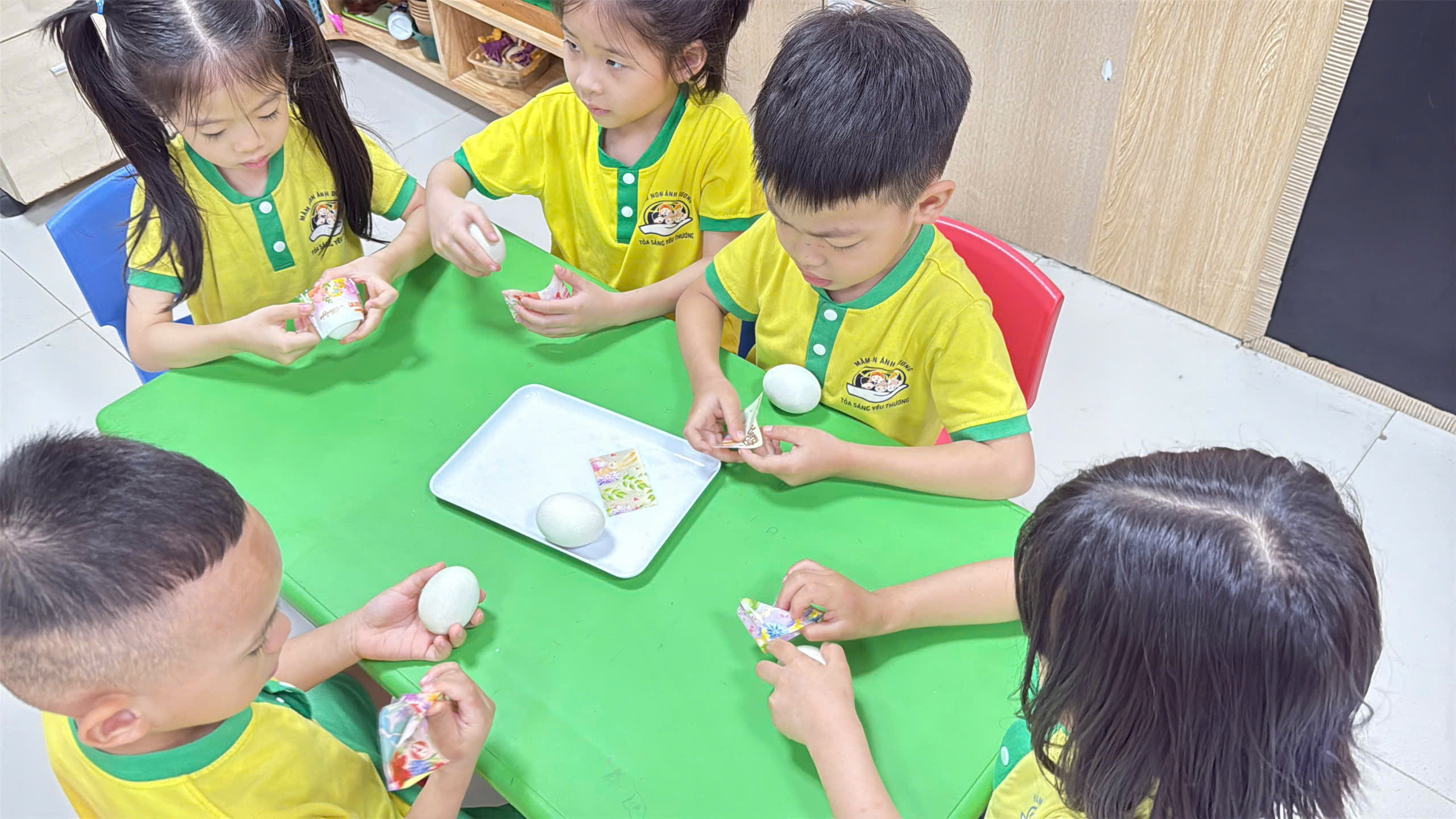 Mở đầu ngày hội là hoạt động trang trí và bọc trứng. Tại sao lại là quả trứng? Trong khoa học giáo dục, quả trứng là biểu tượng hoàn hảo nhất để dạy trẻ về sự sống, sự khởi đầu và hy vọng.