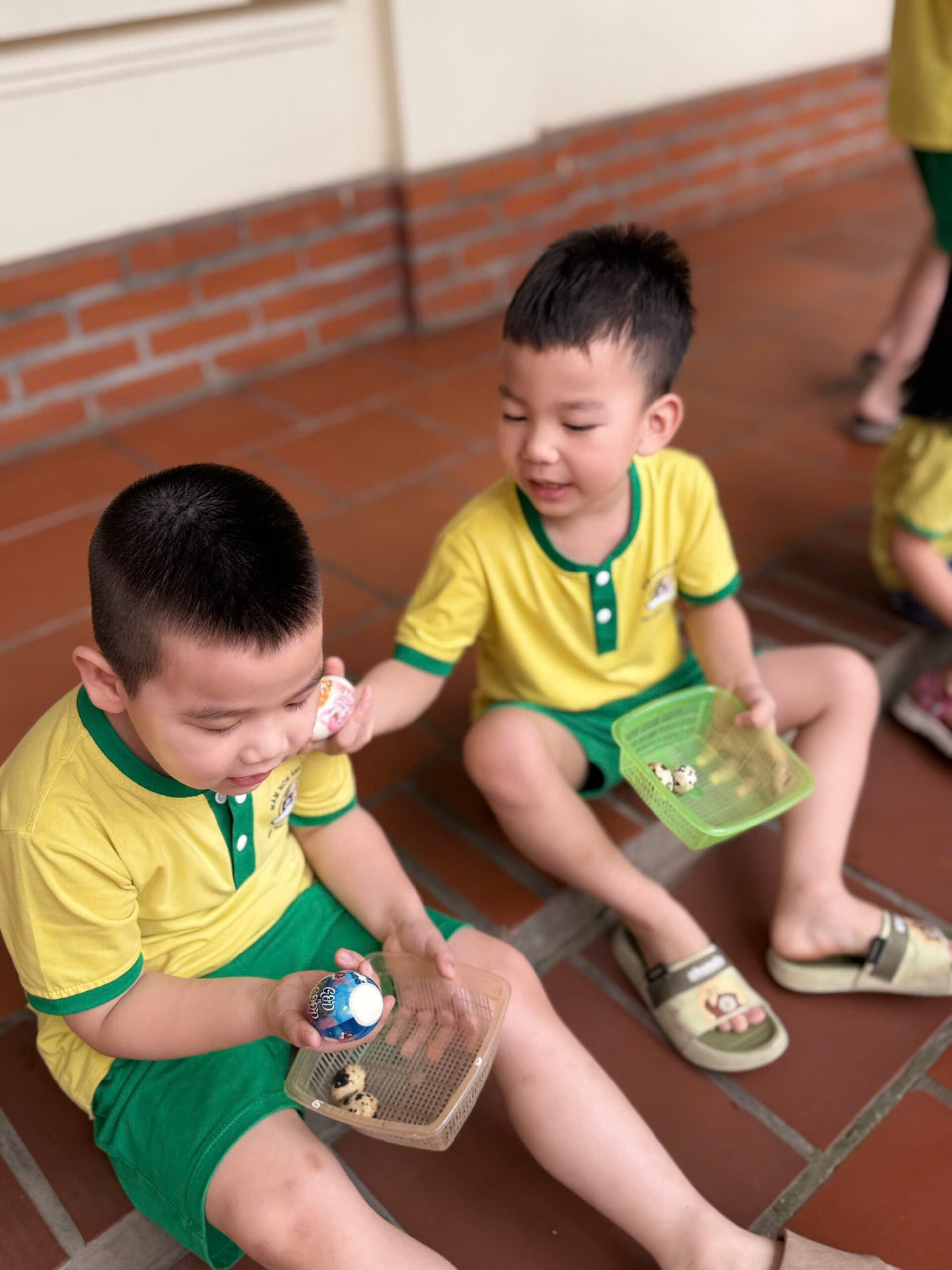 Ngồi quây quần bên nhau, các con cùng bóc vỏ trứng và thưởng thức thành quả. Đây là lúc giáo dục vệ sinh và dinh dưỡng được lồng ghép khéo léo. Các Soeurs, các cô hướng dẫn trẻ cách bóc trứng sạch sẽ, cách bỏ vỏ đúng nơi quy định và giải thích về giá trị dinh dưỡng của trứng – nguồn protein tuyệt vời giúp cơ thể lớn nhanh và khỏe mạnh.
