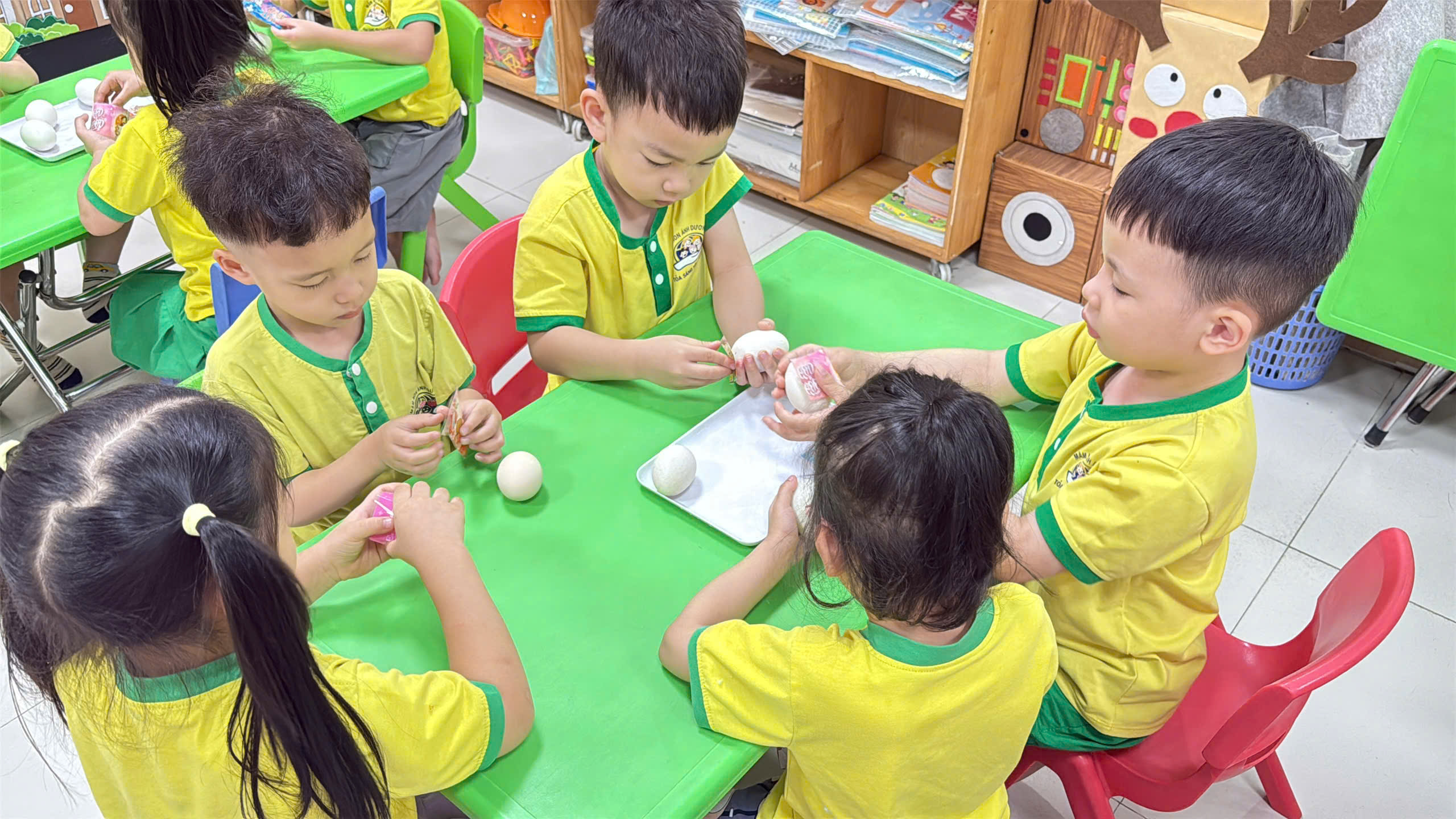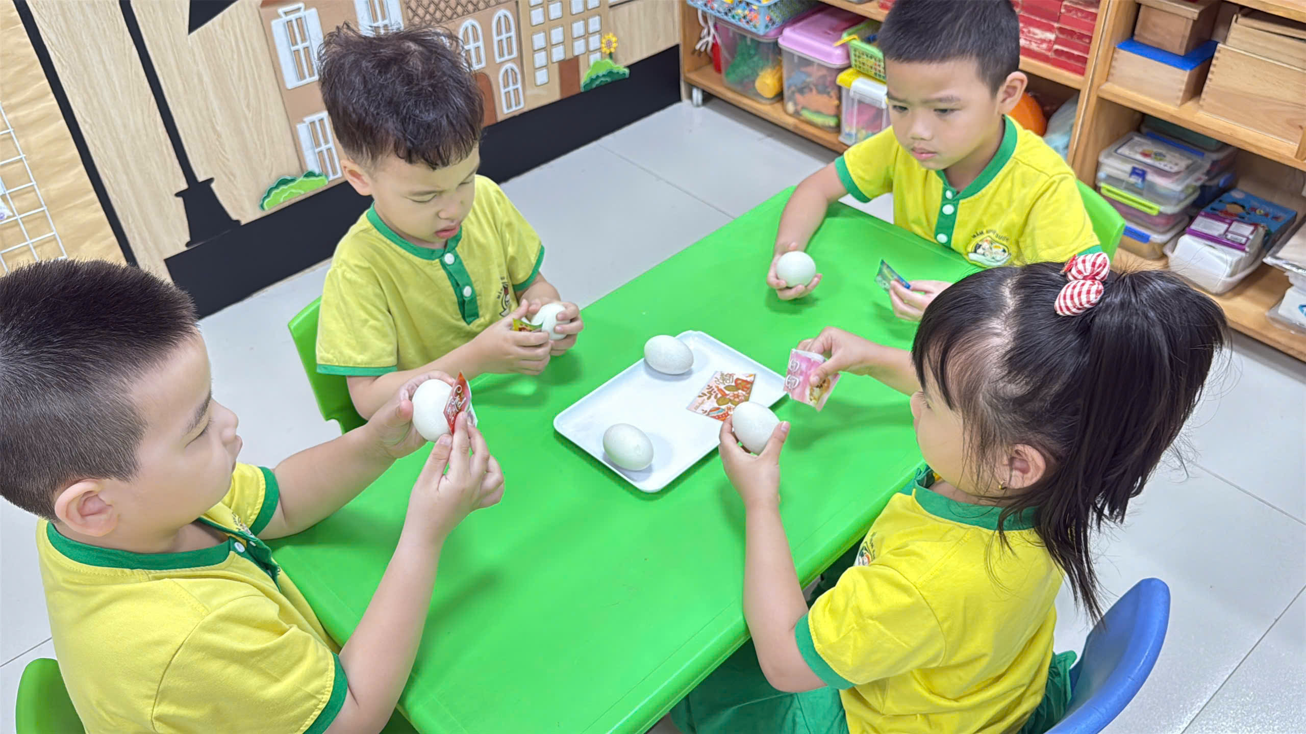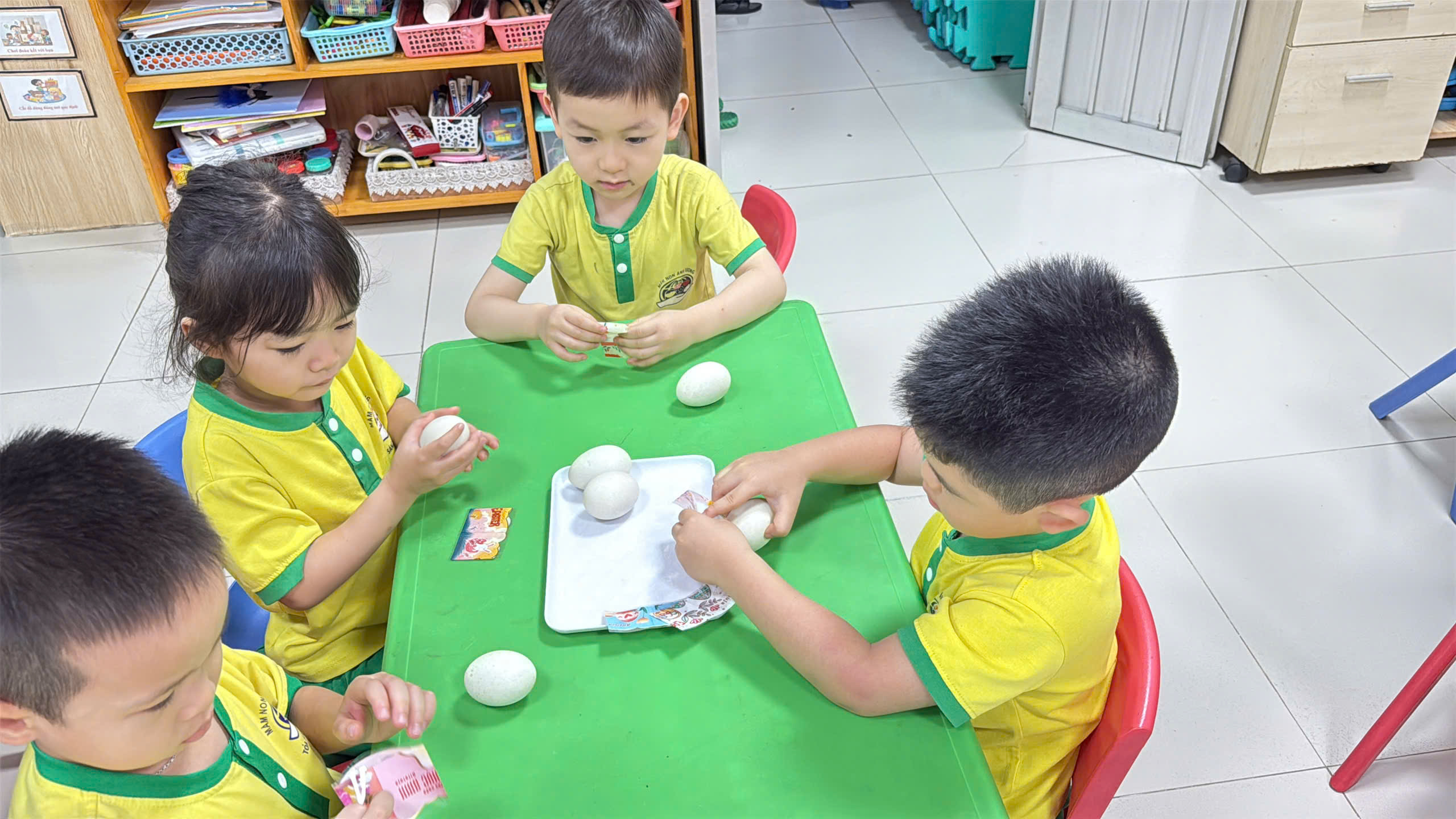 Mở đầu ngày hội là hoạt động trang trí và bọc trứng. Tại sao lại là quả trứng? Trong khoa học giáo dục, quả trứng là biểu tượng hoàn hảo nhất để dạy trẻ về sự sống, sự khởi đầu và hy vọng.